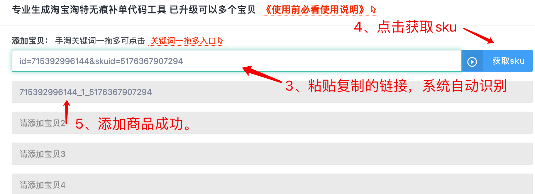 可以使用商品id自动获取sku信息,当出现无法自动获取sku信息时,也可手工添加商品id和skuid。