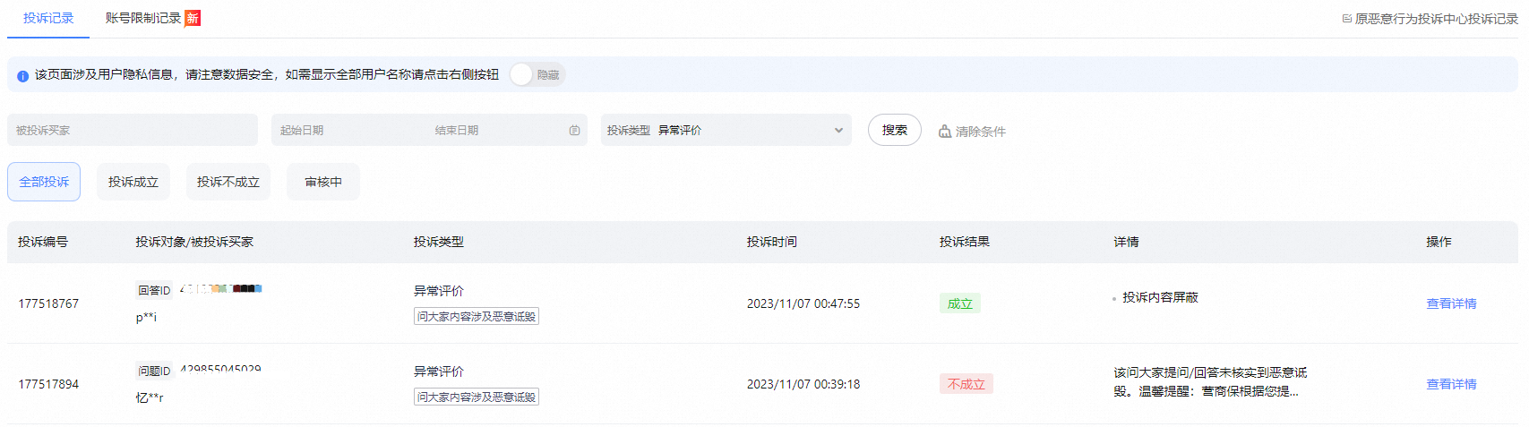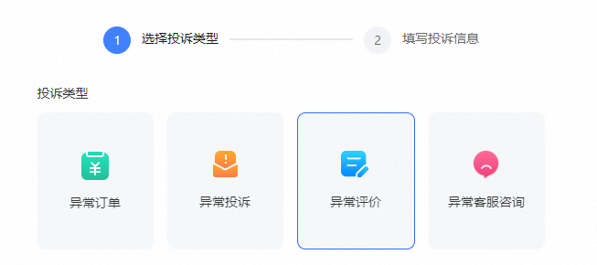 在投诉类型中筛选 “异常评价” 查看投诉结果