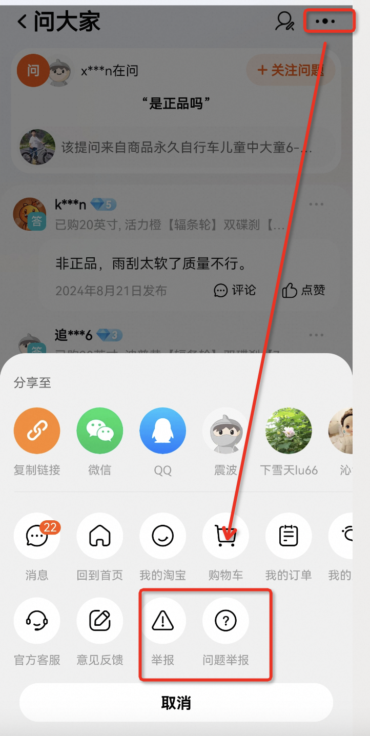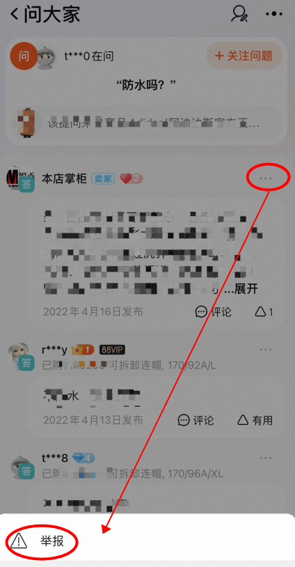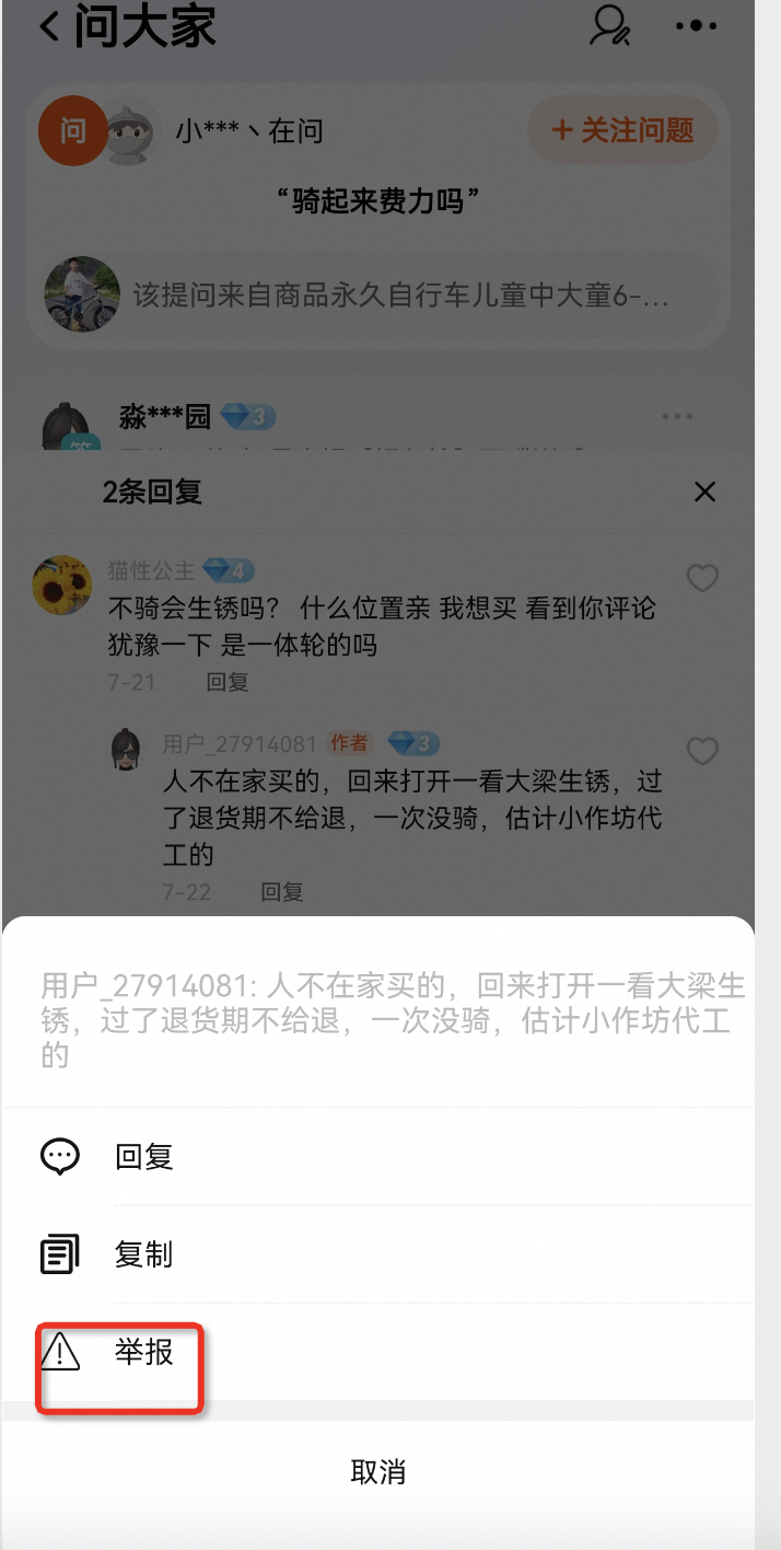 投诉路径:登录手机淘宝app -【商品详情页】-【问大家】- 点击【查看全部】- 找到需要举报的问题/回复 - 进入问题【详情页】- 点击需要举报的问题/回复后面的【...】点击【举报】按钮。若要投诉回答里的评论,请长按评论内容,点击【举报】。