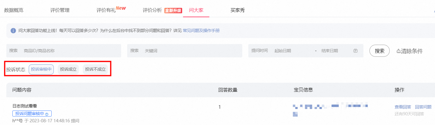 提问内容产生的180天(含)可投诉提问内容,回答内容产生的30天(含)可投诉回答内容。商家可通过该问大家管理列表页的投诉倒计时查看投诉有效期。若超出时间,则无法在此处发起投诉。