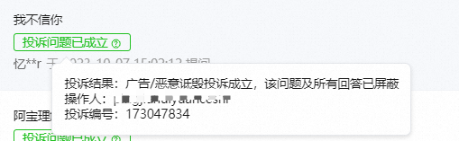 当提问成立,则提问和回答均屏蔽;当回答投诉成立,则该条回答被屏蔽(提问不受影响)。