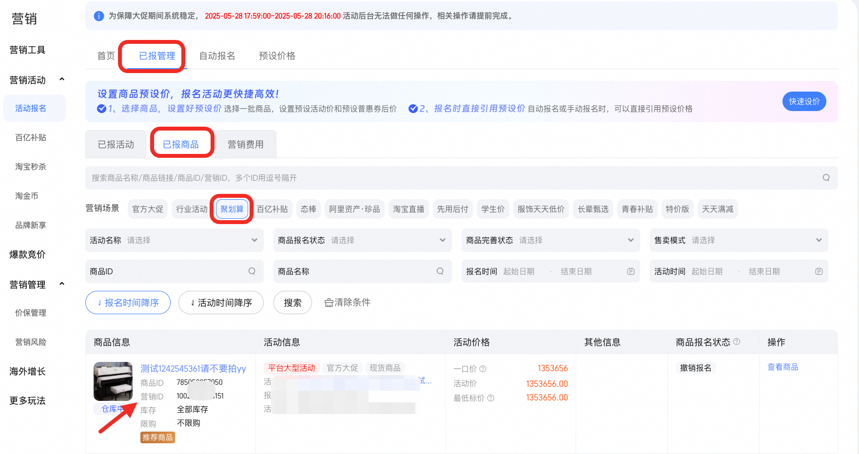 查看聚划算的juid/营销id,您可以点击【活动报名】-【已报管理】-【已报商品】-【聚划算】找到对应商品,查看下方的营销ID。