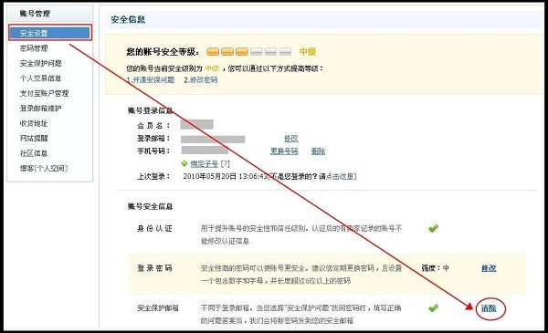 如您需要修改安全保护邮箱,需要登录“我的淘宝”-“账号管理”-“安全设置”页面先清除已有安全邮箱,再重新设置,操作步骤如下: