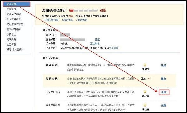 第三步:再次进入“我的淘宝”-“账号管理”-“安全设置”页面,点击“开通”进行设置即可。