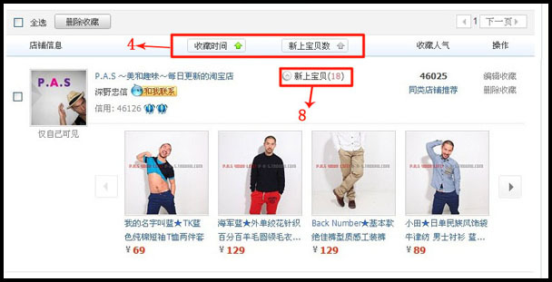 4、排序方式:在宝贝收藏页面中可按收藏时间/价格/剩余时间顺序显示您的收藏;在店铺收藏页面中可按收藏时间/新上宝贝数顺序显示您的收藏。