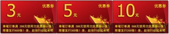 然后亲们就可以随意点击啦,想要多少面值的就直接点击相应的图片。同一个ID(淘宝帐号)领取同一面值的优惠券只可以领取一张,建议亲们都领取吧,也被不时之须。毕竟数量有限,怕以后在用的时候没有了,那不是后悔呀。多领一张他又不会和你要饭吃。(*^__^*) 嘻嘻。。。每张优惠券只要达到图片下方标明的价格后才可以使用一张。