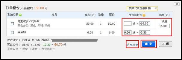 您可以直接在“涨价或折扣”栏中直接填写相关的折扣或优惠的金额(负数代表优惠折扣),同时您也可以在“邮费”栏中直接添加需要修改的邮费金额,填写完成后点击“确定”即可。如果卖家包邮,也可以直接点击“免运费”,即邮费金额为0元。