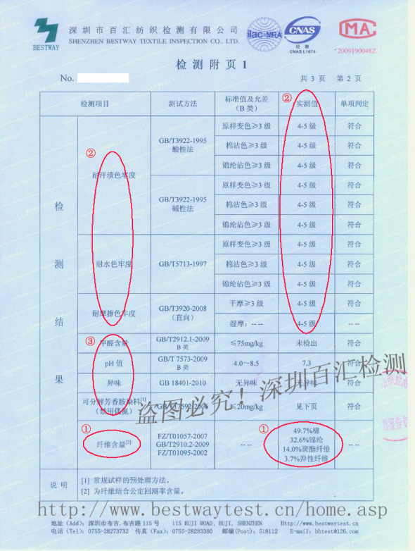 在误差允许的范围内,小二说是50%!的(MISSING)棉是完全没错的!其他成分也显示出来! 各种色牢度,再看右边的等级,等级越高越好,说明多种洗涤方式下,都不会掉色! 有害物质、HP值等,也完全未检出,说明对人体皮肤没有伤害,一件安全的服饰! 很基本的一份检出报告,再看几项重要的检测结果,卖家推销起来信心十足,买家购买,也心里踏实!后续还会教大家看检测报告的其他相关检测项目,祝大家买得放心、卖得舒心~~