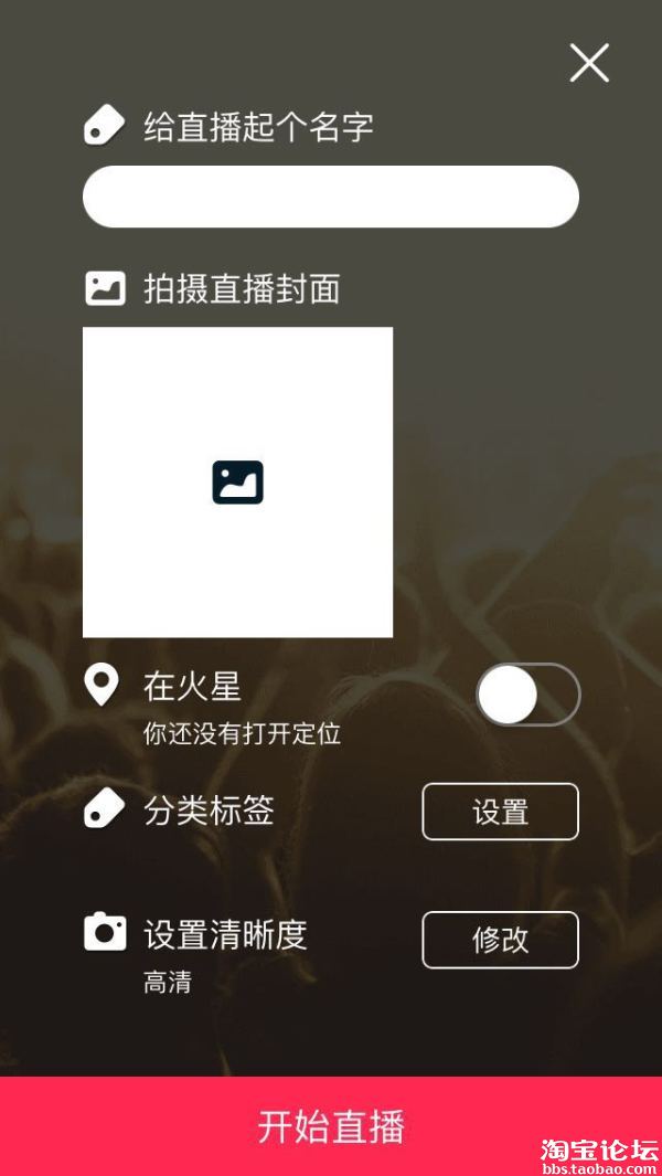 在这个界面你可以拟定直播的标题,设置直播的封面图(支持在从相册中选择照片或者自行拍照,重点是可以选择各种水印哦~,见下图2)、打开你的定位分享等,选择内容分类标签(你可以选择推荐的系统标签来打,也可以自行编写标签,但是相同类型的标签只允许打一次哦,标签规则点此查看),同时亲还可以根据自己的网络带宽来设置清晰度,具体见下图
