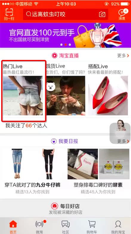 1、打开手机淘宝,首页下拉到“淘宝直播”, 点击“热门Live”