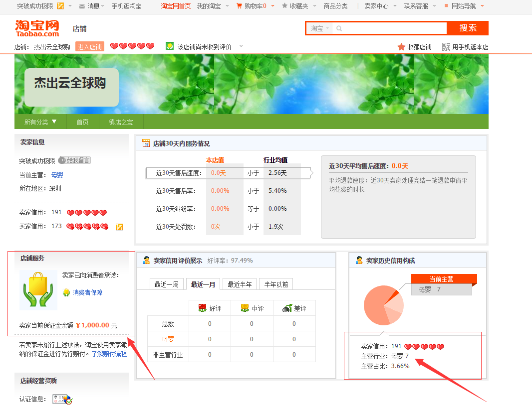 当你用鼠标点击这个五心时,就进入一个卖家信息的界面,在这里,有2个最重要的细节,我都用红色的框和箭头标准出来了。