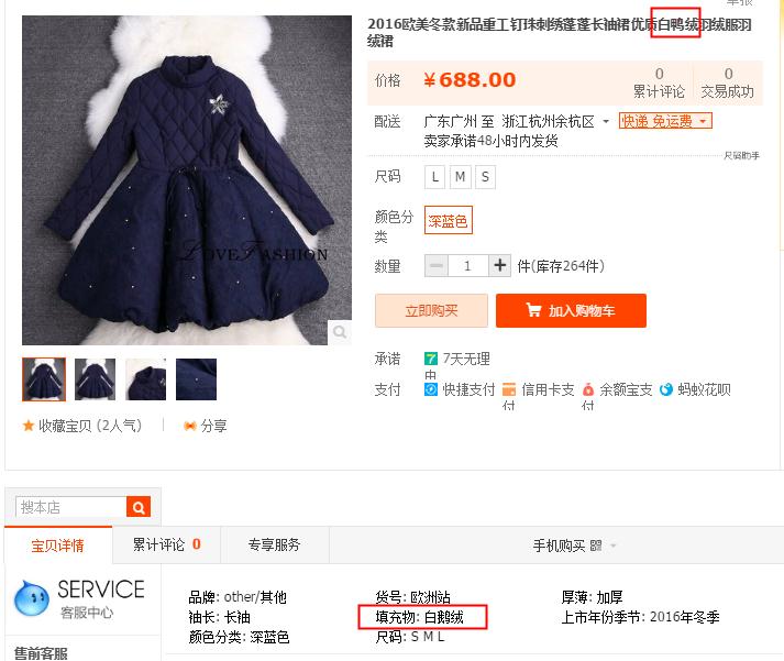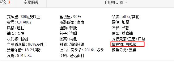 1:如标题描述白鸭绒,但在商品属性中填充物选择为’白鹅绒’,字都不一样那肯定是不一致的嘛。评审员宝宝们一定要看仔细了