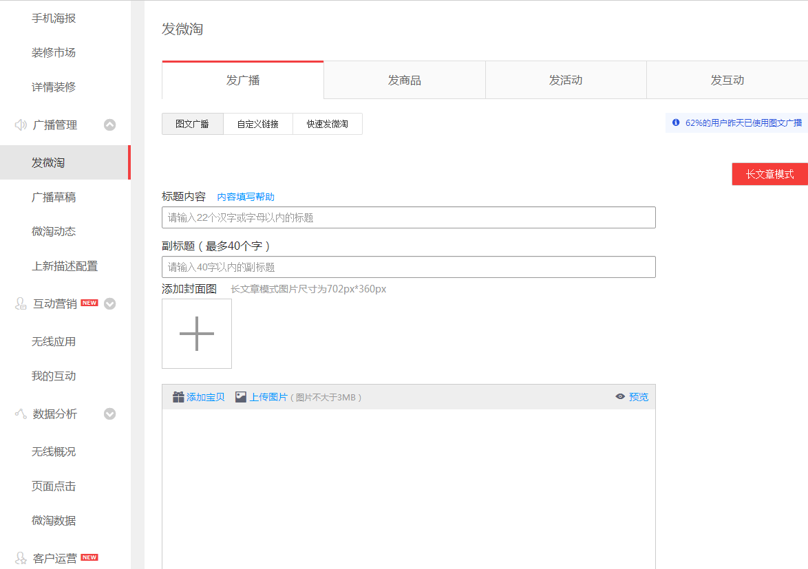 重要性知道了,那么我们得知道怎么发布广播,打开我们的无线运营中心,我们就可以编辑广播了,发广播涉及了标题、副标题、封面图还有正文,在底部可以添加活动跟页面链接,完成这一切那么我们广播就发好了。