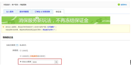 答:在“卖家中心-加入服务-保证金-自定义额度一栏中输入5000元”申请加入消保,并缴纳保证金。按照下图方式,选择自定义额度:5000即可