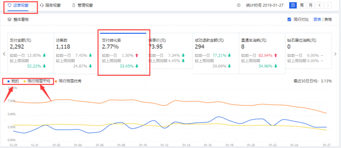 步骤1:查看最近30天的支付转化率情况:打开生意参谋 – 运营视窗 – 支付转化率,下面蓝线是自己店铺转化率情况,黄色是同行同层平均,如果蓝线一直处于黄线下面,那么需要去提升好店铺支付转化率,转化越高,说明流量精准,流量价值高,后期淘宝才会给到更多的流量。